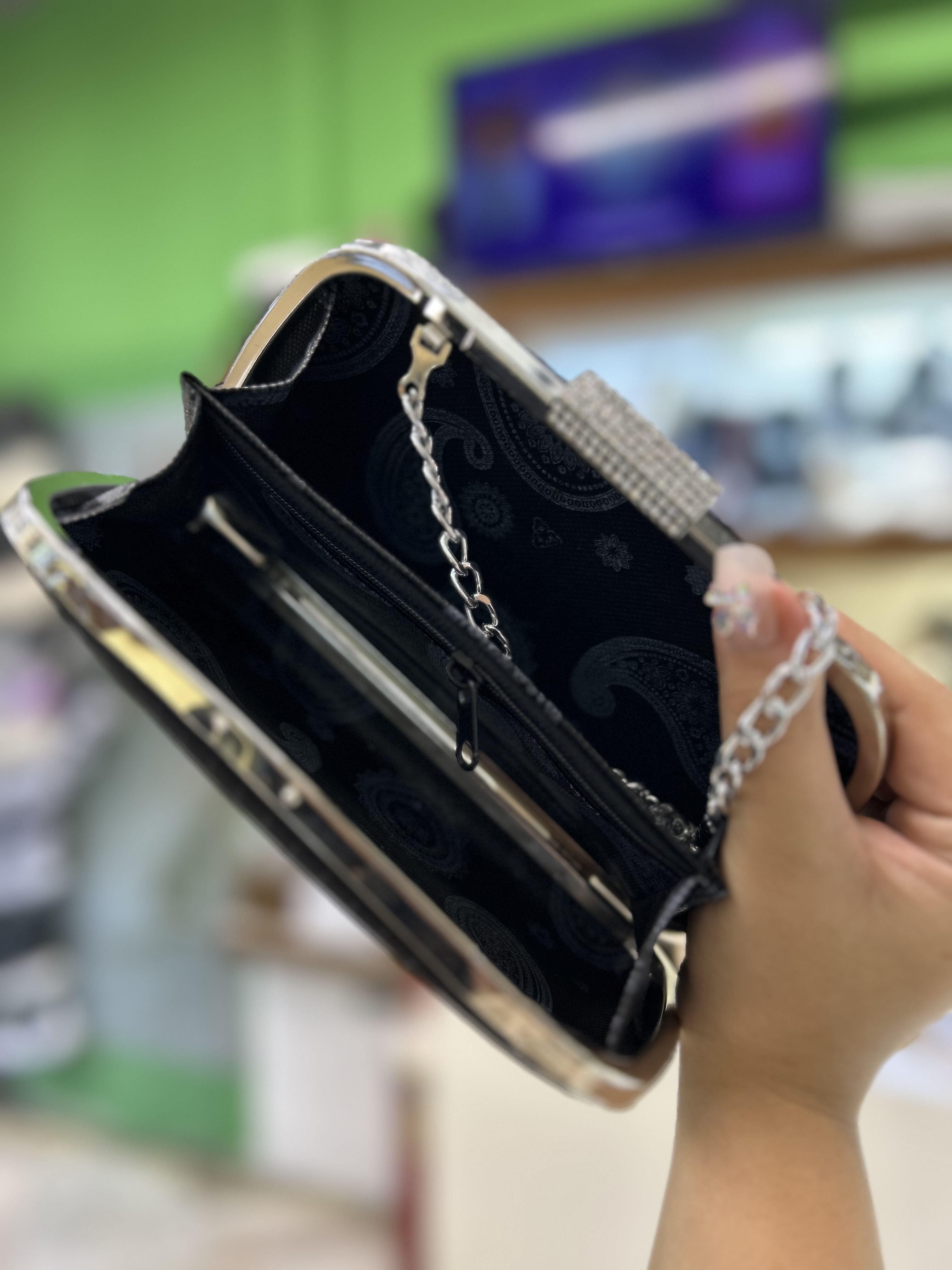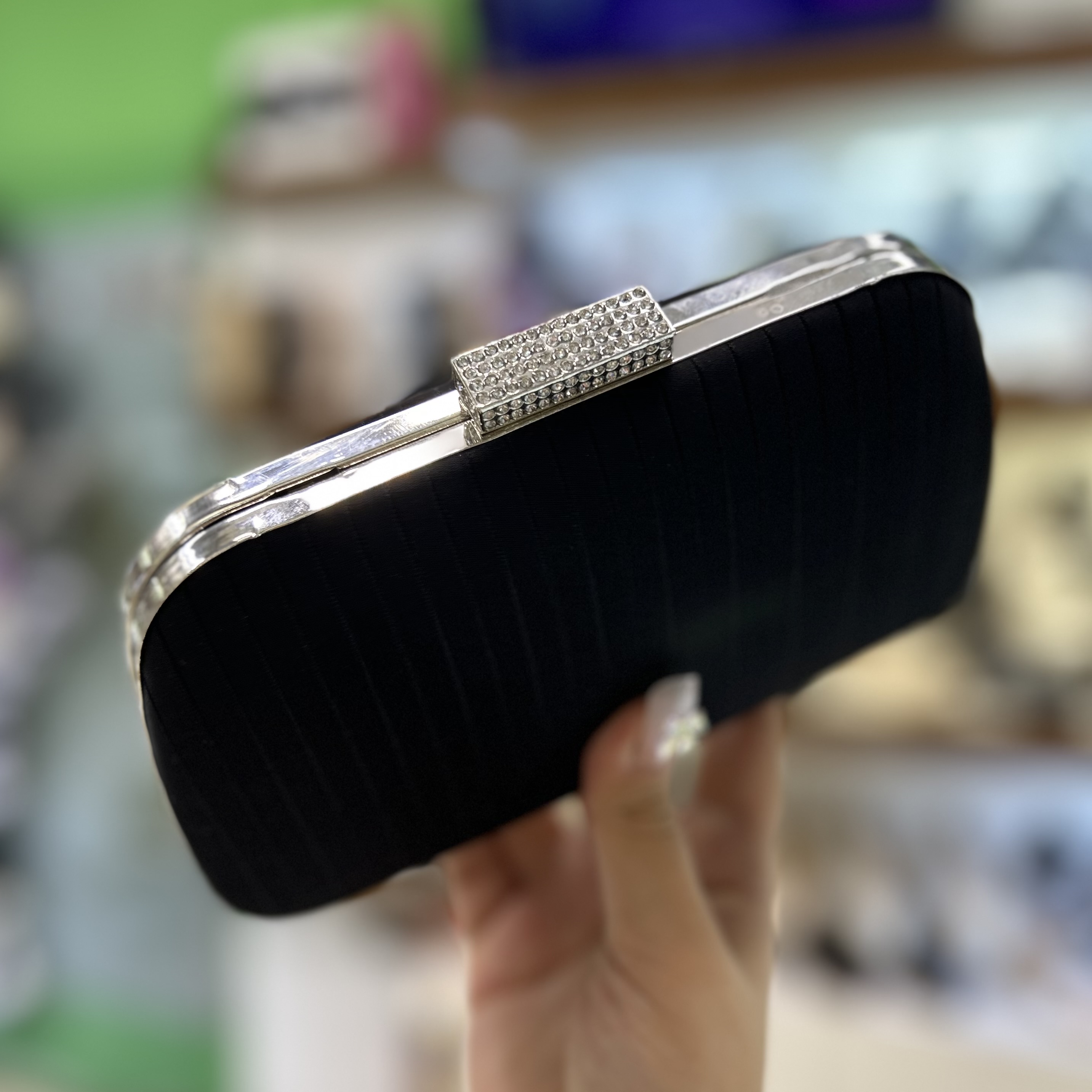 کیف شب مجلسی زنانه ساتن خطی بسیار شیک دهنه نقره ای وارداتی با کیفیت بدون تغییر رنگ دارای زیپ وسط کیف و بند بلند زنجیری