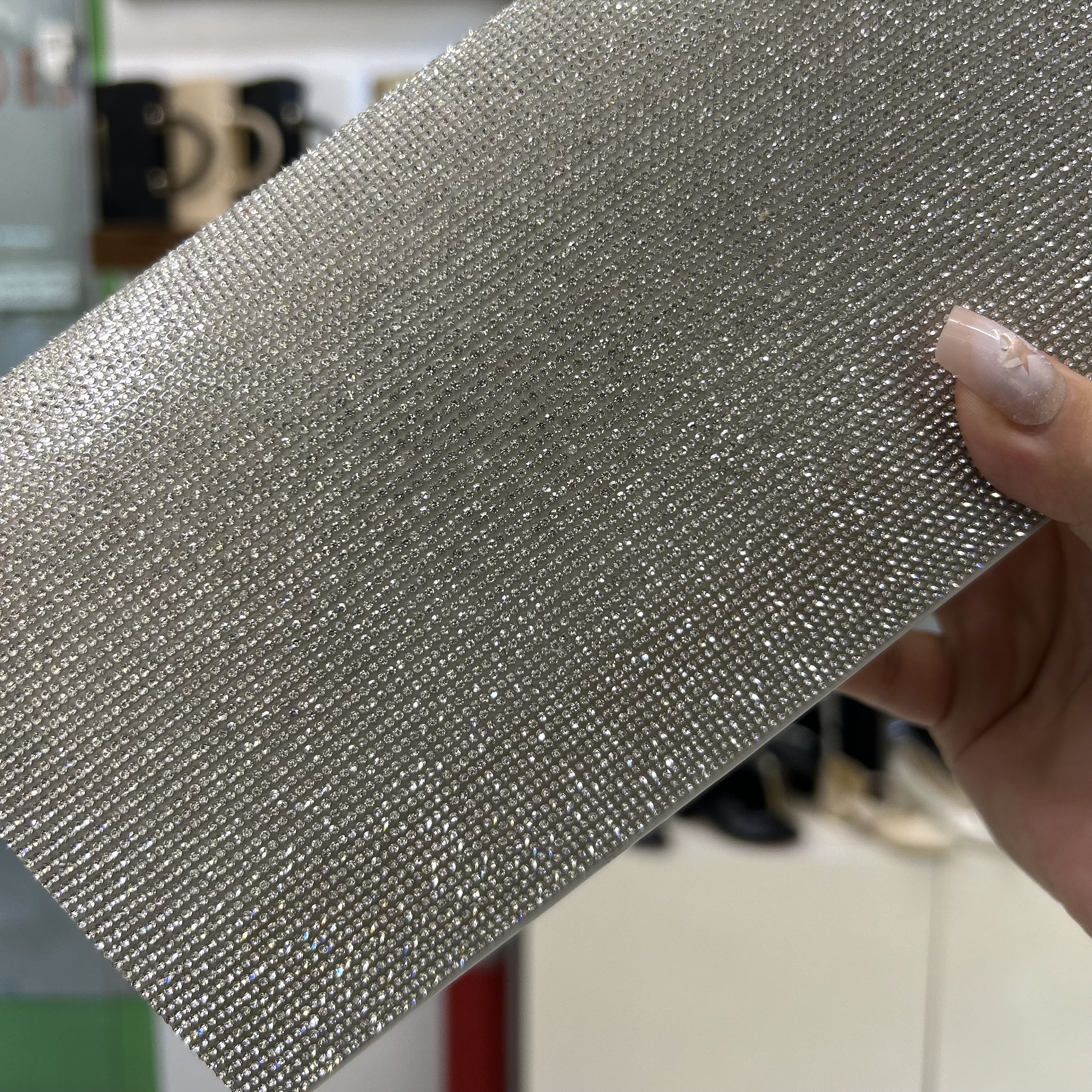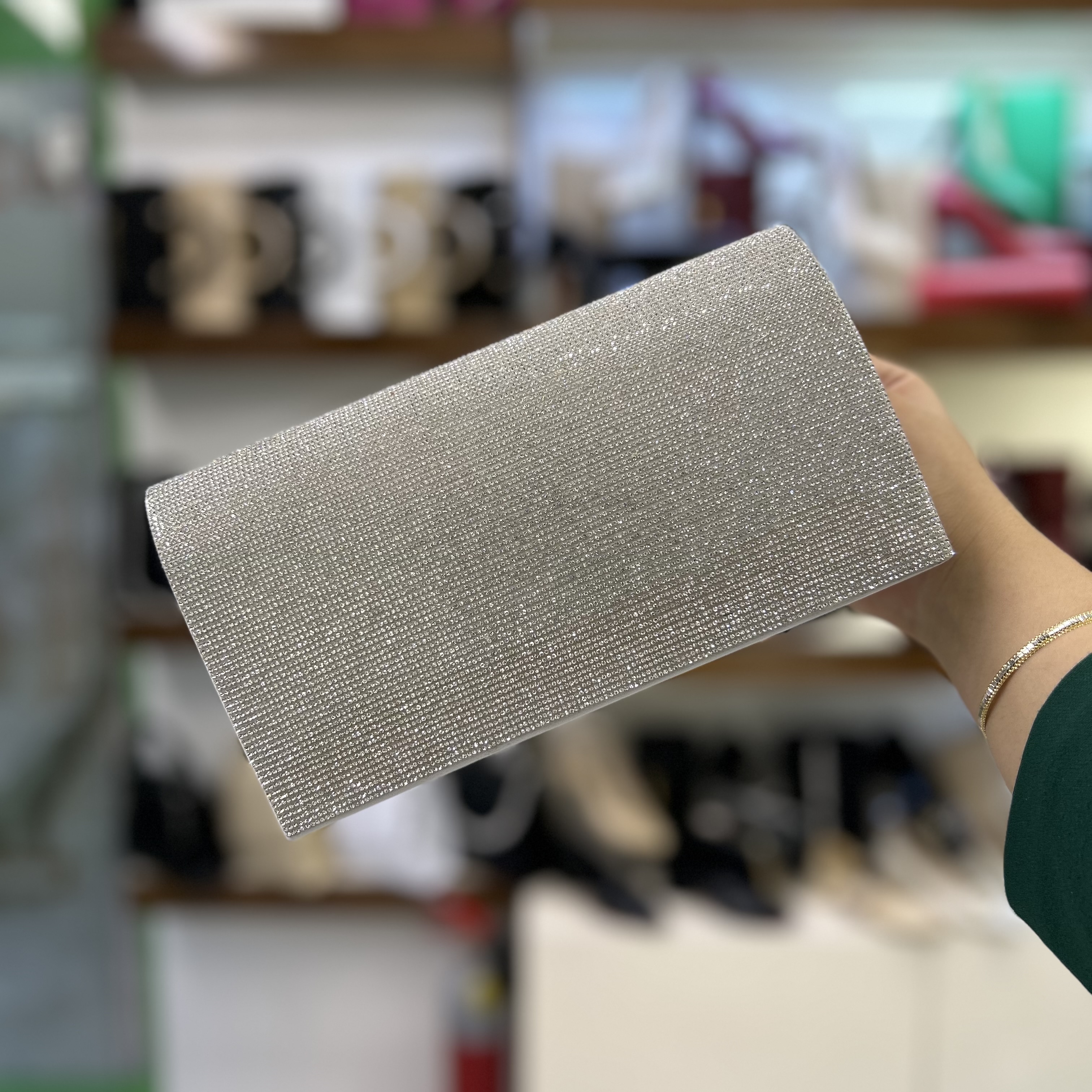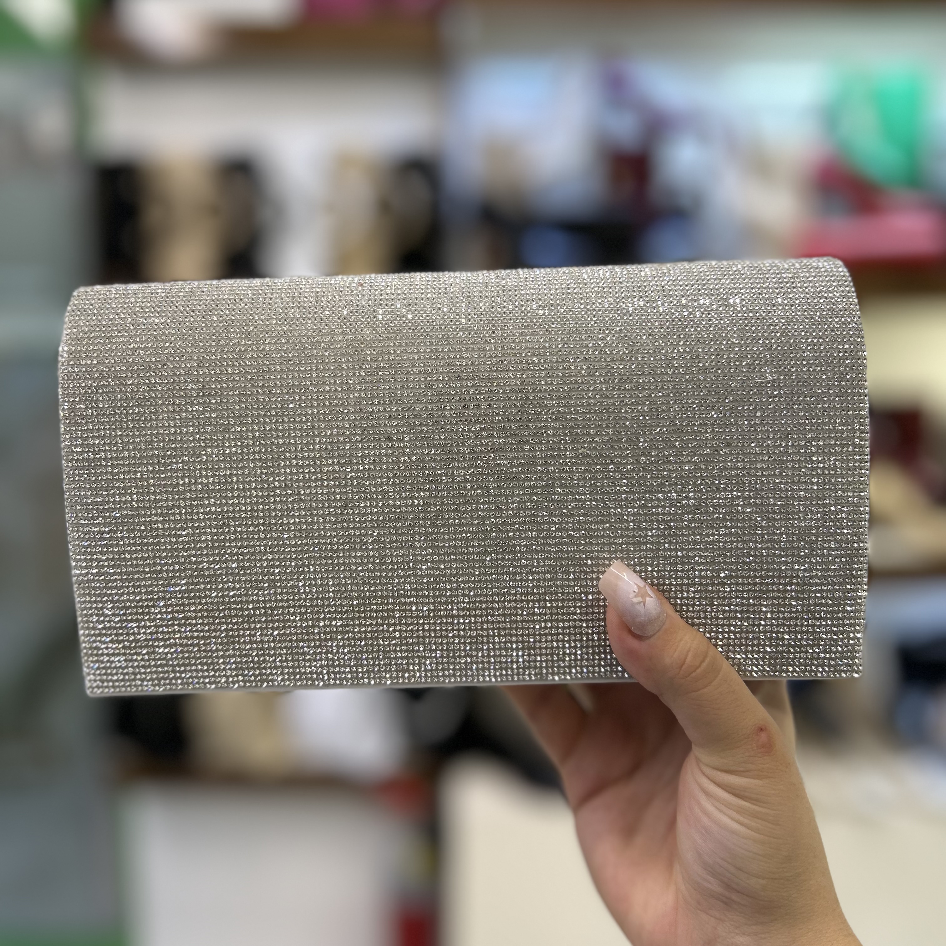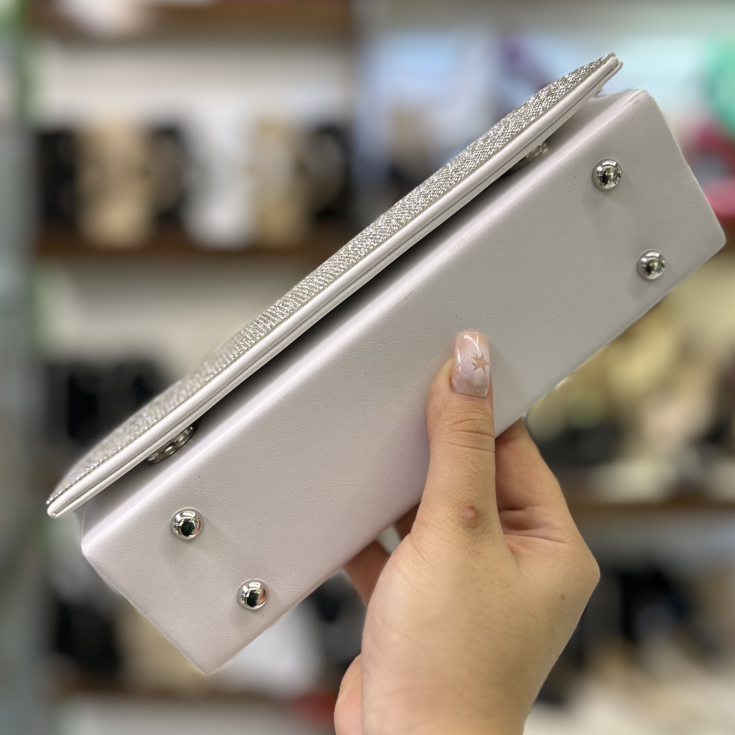 کیف شب فول نگین مجلسی زنانه ، پشت کیف چرم ساده سفید ، دارای بند بلند زنجیری و دسته دار