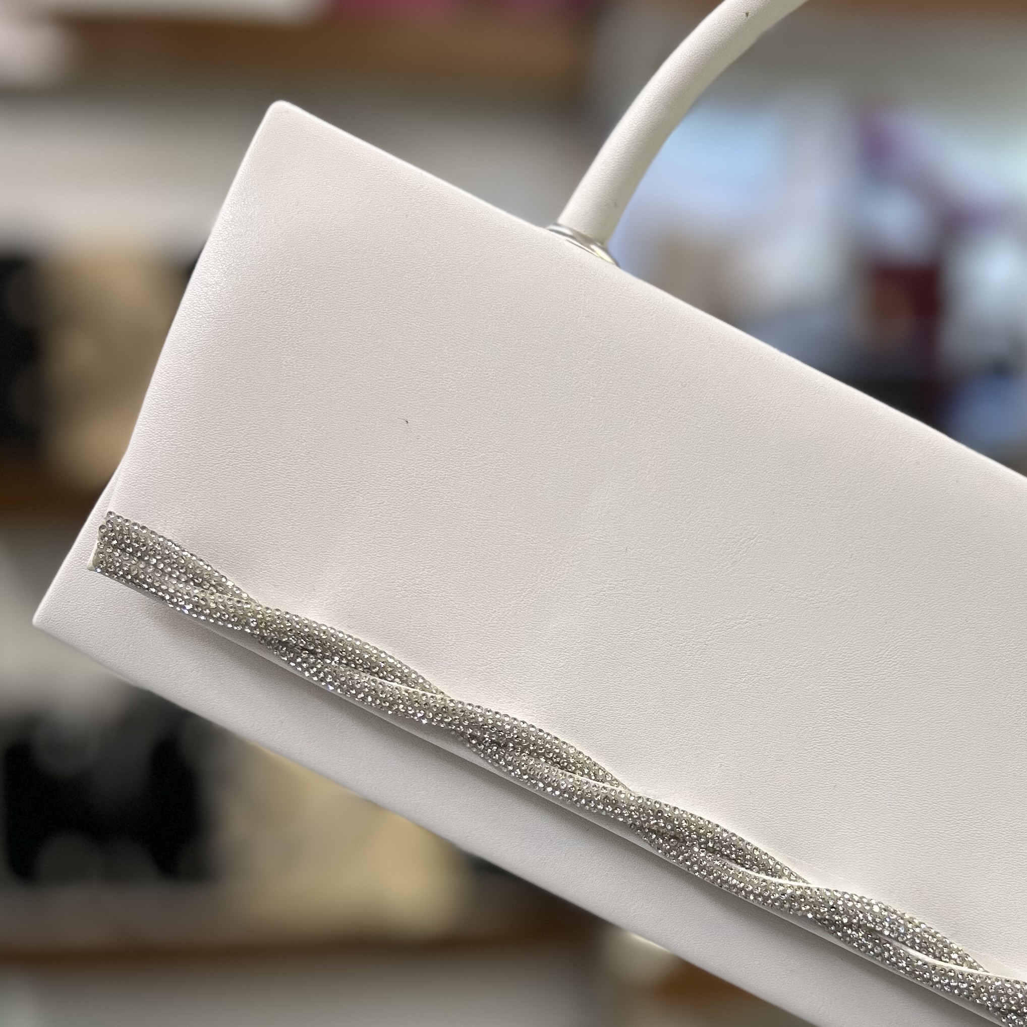 کیف شب فول نگین مجلسی زنانه ، پشت کیف چرم ساده سفید ، دارای بند بلند زنجیری و دسته دار